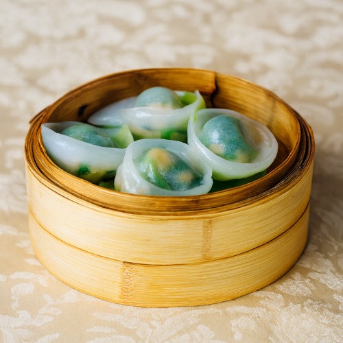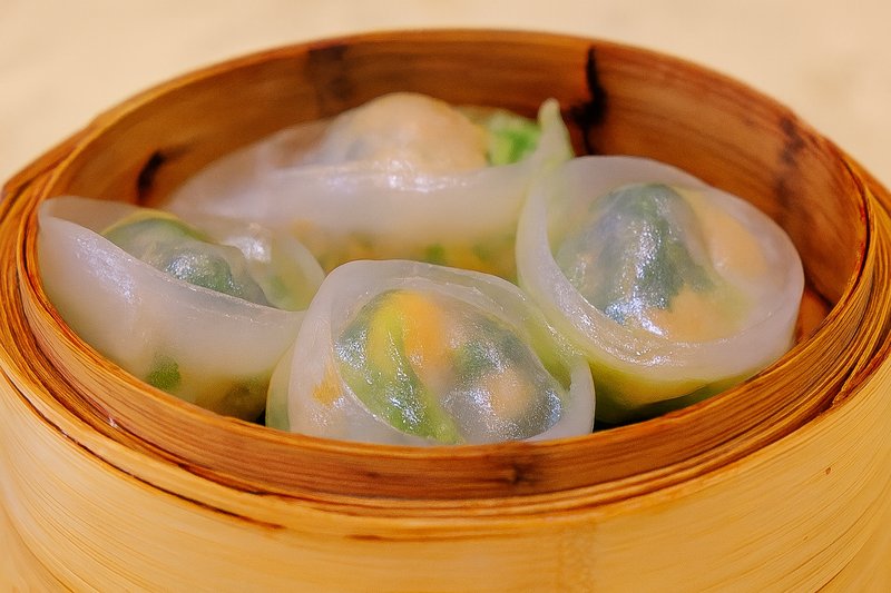 Translucent wheat starch wrapper filled with fresh Scallop and vegetable.