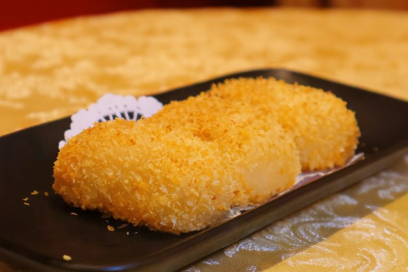Special dim sum dessert with a soft, lightly pan-fried pancake filled with crushed peanuts and shredded coconut.
